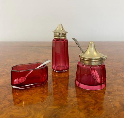Late 19th Century Victorian antique cranberry glass cruet set consisting of a table salt, pepper pot with a spoon and a mustard pot with a spoon