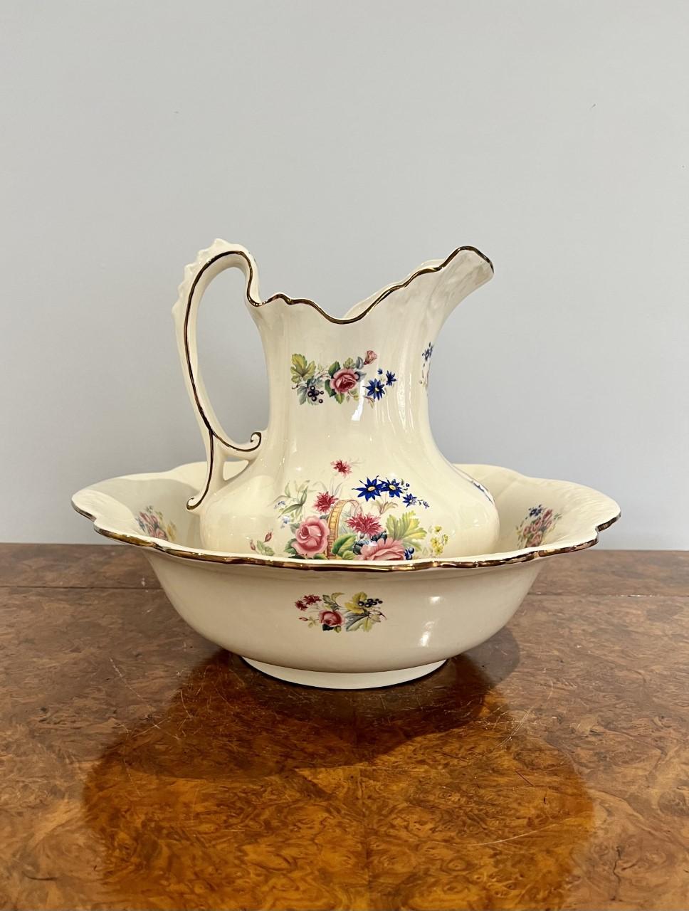 Antique Edwardian jug and bowl set having a quality Edwardian jug and bowl set with wonderful decoration of flowers and leaves in fantastic red, yellow, green, blue, pink and yellow colours with a gilded edge