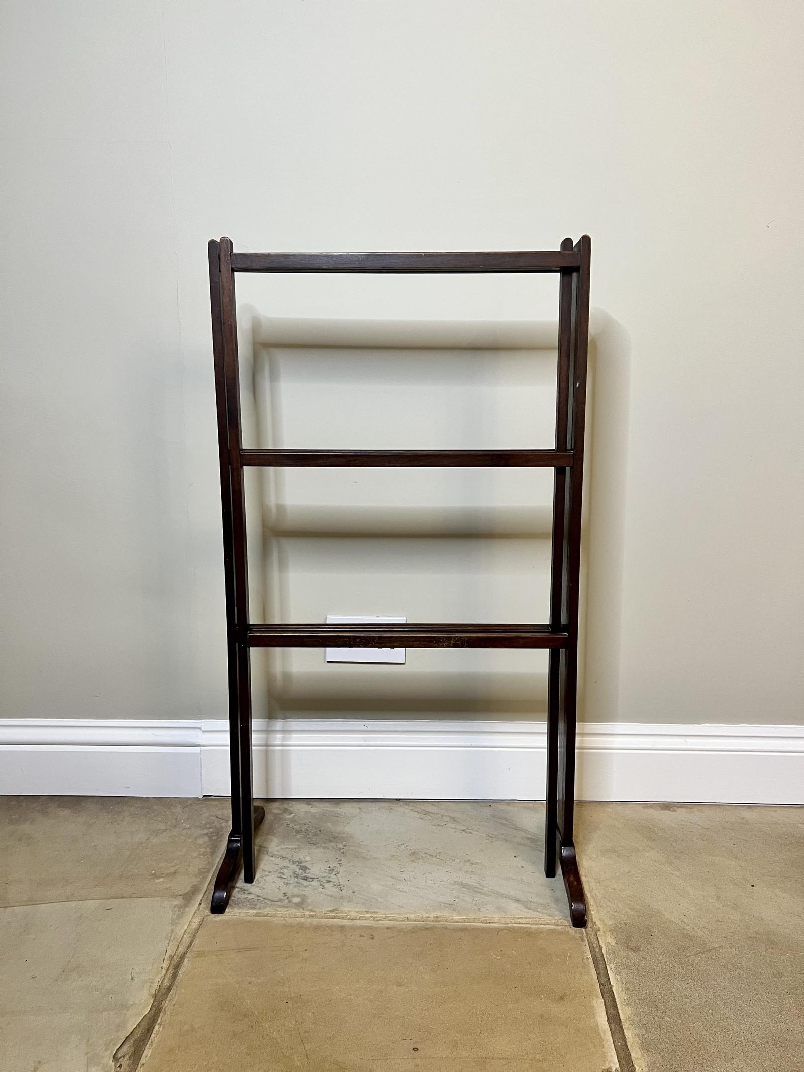 Antique Edwardian mahogany folding clothes airer having a double gate folding action with nine mahogany splats, standing on shaped feet.