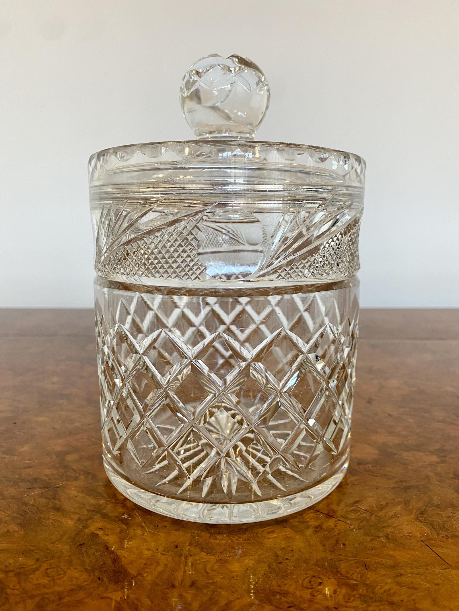 Antique Edwardian quality cut glass biscuit barrel, quality cut glass biscuit barrel with a lift off cut glass lid.