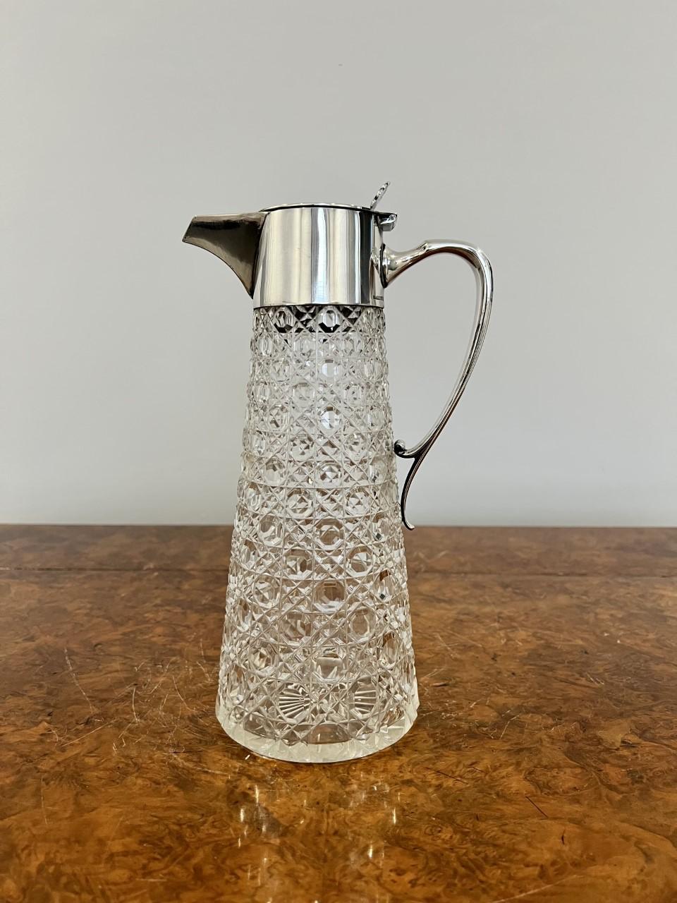 Antique Edwardian quality cut glass and silver plated claret jug having a quality cut glass claret jug with a silver plated shaped handle and lid