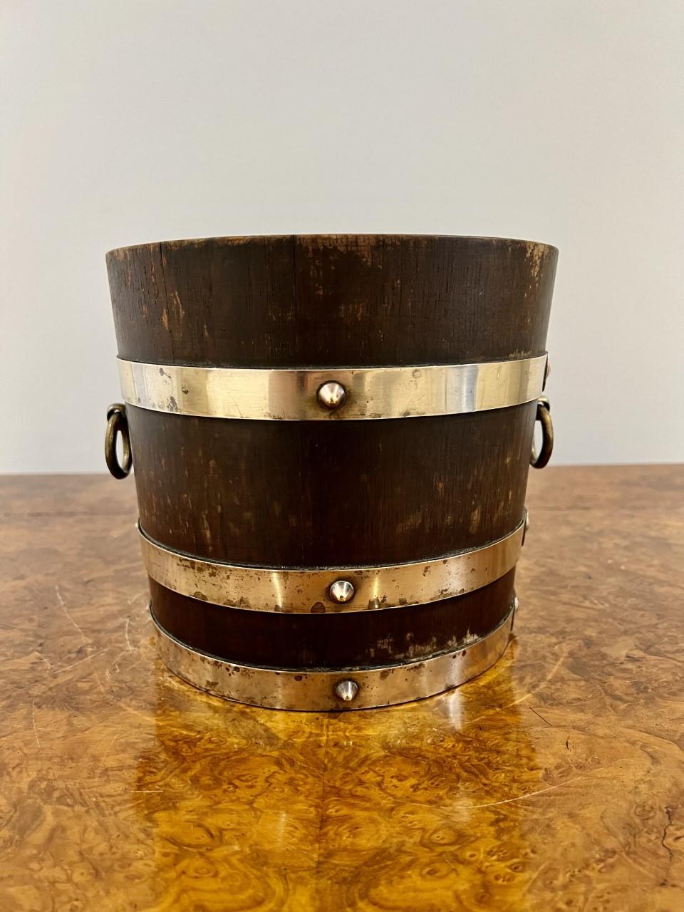 Antique Edwardian quality oak brass bounded jardiniere having a quality circular oak jardiniere with original brass bounds and brass carrying handles