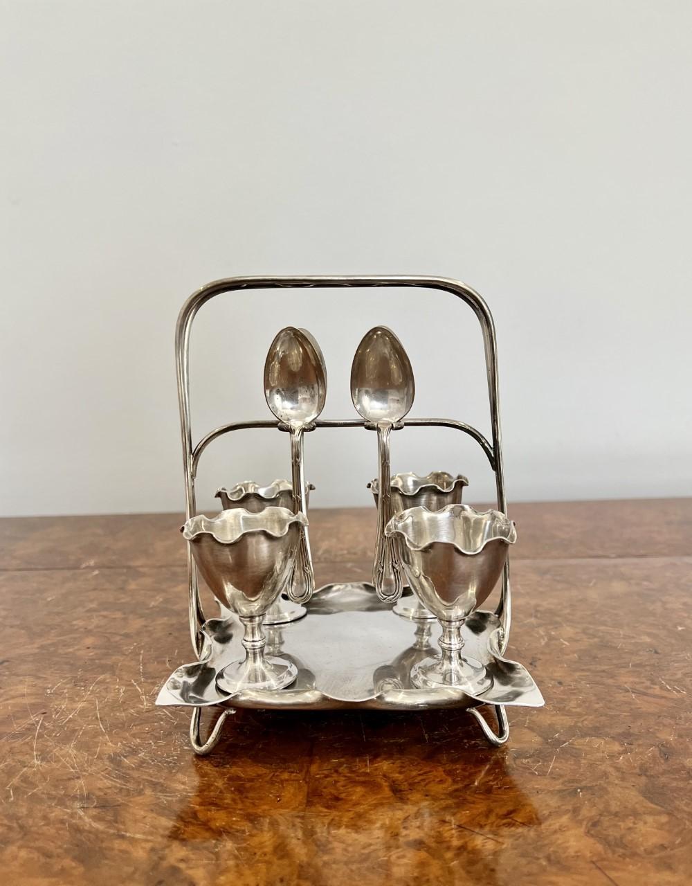 Antique Edwardian quality silver plated egg cruet set, having a quality silver plated stand with four silver plated egg cups and spoons.