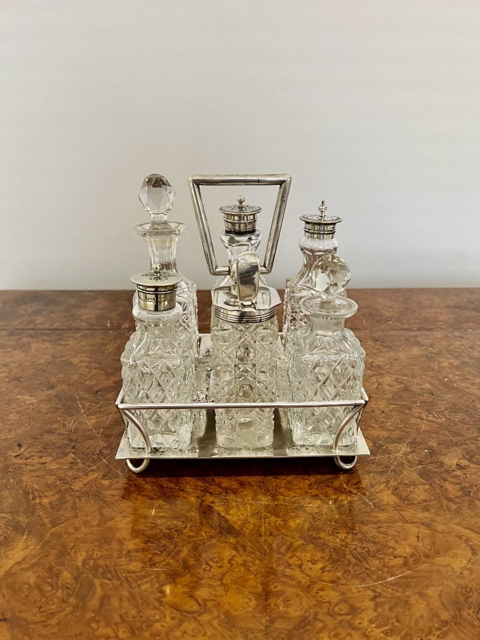 Antique Edwardian silver plated cruet set having a quality silver plated stand with a shaped handle with six original cut glass bottles with silver plated tops, for salt, pepper, vinegar, mustard and oils.