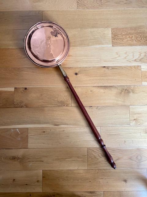 Antique George Iii copper warming pan having the original turned handle, copper warming pan with a lift up lid