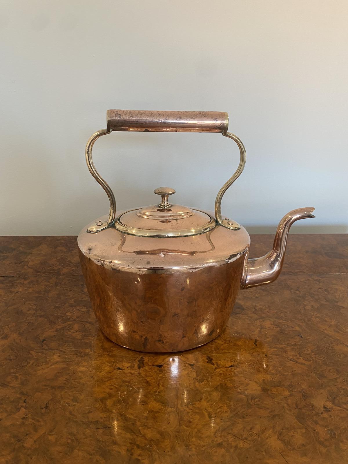 19th Century George Iii antique oval copper kettle having a shaped handle and spout, lift off lid with original knob