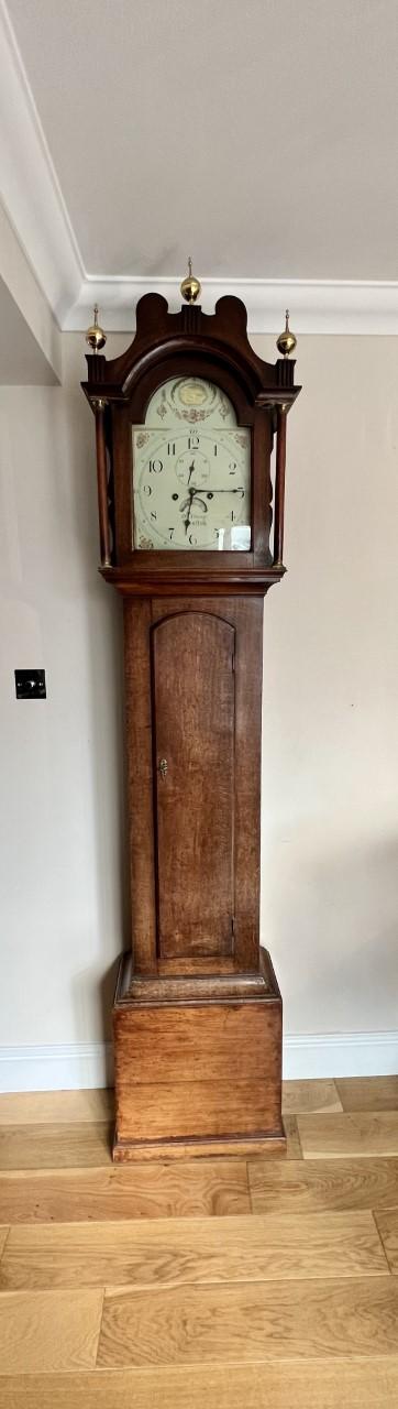 Quality antique George III mahogany long case clock with a painted arched dial, original hands, with an 8 day movement striking the hour and half hour on a bell, with original weights and pendulum.