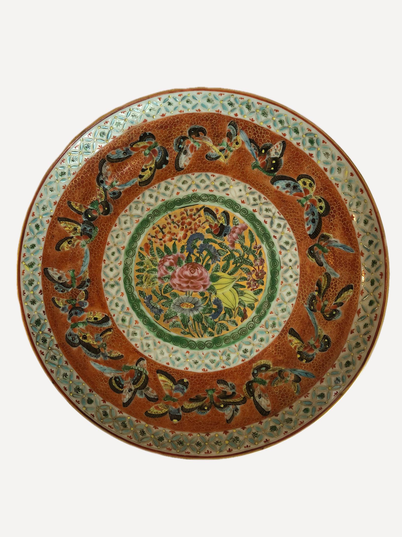 Antique Japanese quality hand painted plate having wonderful decoration with butterflies, flowers, leaves & foliage in red, green, blue, orange & gold colours.