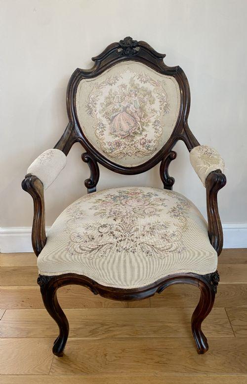 Quality 19th Century French antique carved walnut armchair having a quality carved walnut shaped back supported by carved scrolls shaped, carved walnut open arms carved frieze standing on shaped carved cabriole legs to the front and outswept back legs upholstered in a quality floral tapestry.