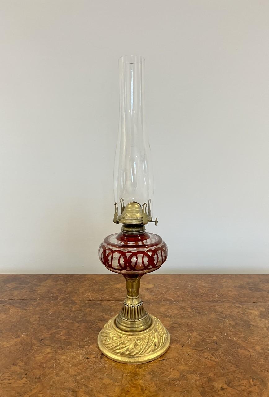 For sale is this late 19th Century Victorian antique brass and glass oil lamp having the original glass chimney above a brass burner ornate decorated glass font supported by a ornate brass circular base