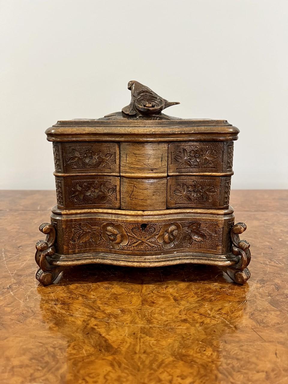 Late 19th Century Victorian antique carved oak jewellery box having floral carved decoration all over with a gaming bird and nest to the top of the box having a lift up lid opening to reveal a jewellery compartment and four swing out drawers fitted with blue interior.
