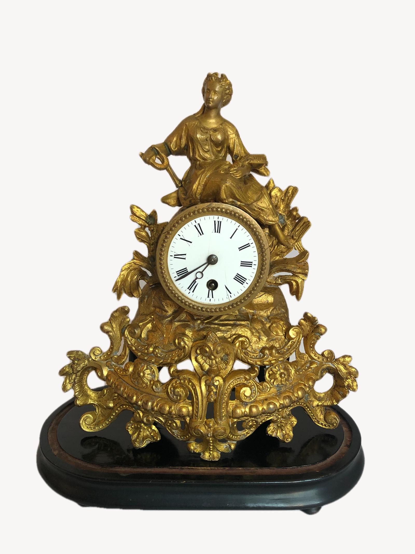 Antique Victorian French ornate gilded mantle clock having a 8 day movement with a white enamel dial and original hands in a ornate gilded case with a seated lady in period clothing to the top above swags, scrolls, leaves and flowers. Perfect working order with original key.