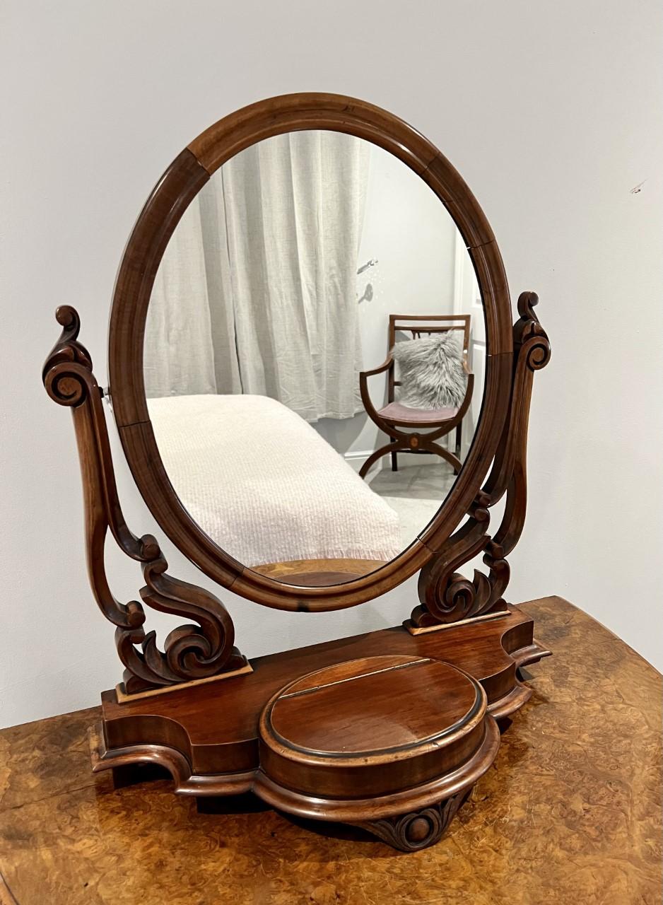 Antique Victorian mahogany dressing table mirror having a quality oval mahogany swing mirror supported by carved mahogany shaped supports, standing on a serpentine shaped base with an oval lift up lid raised on original carved mahogany feet.