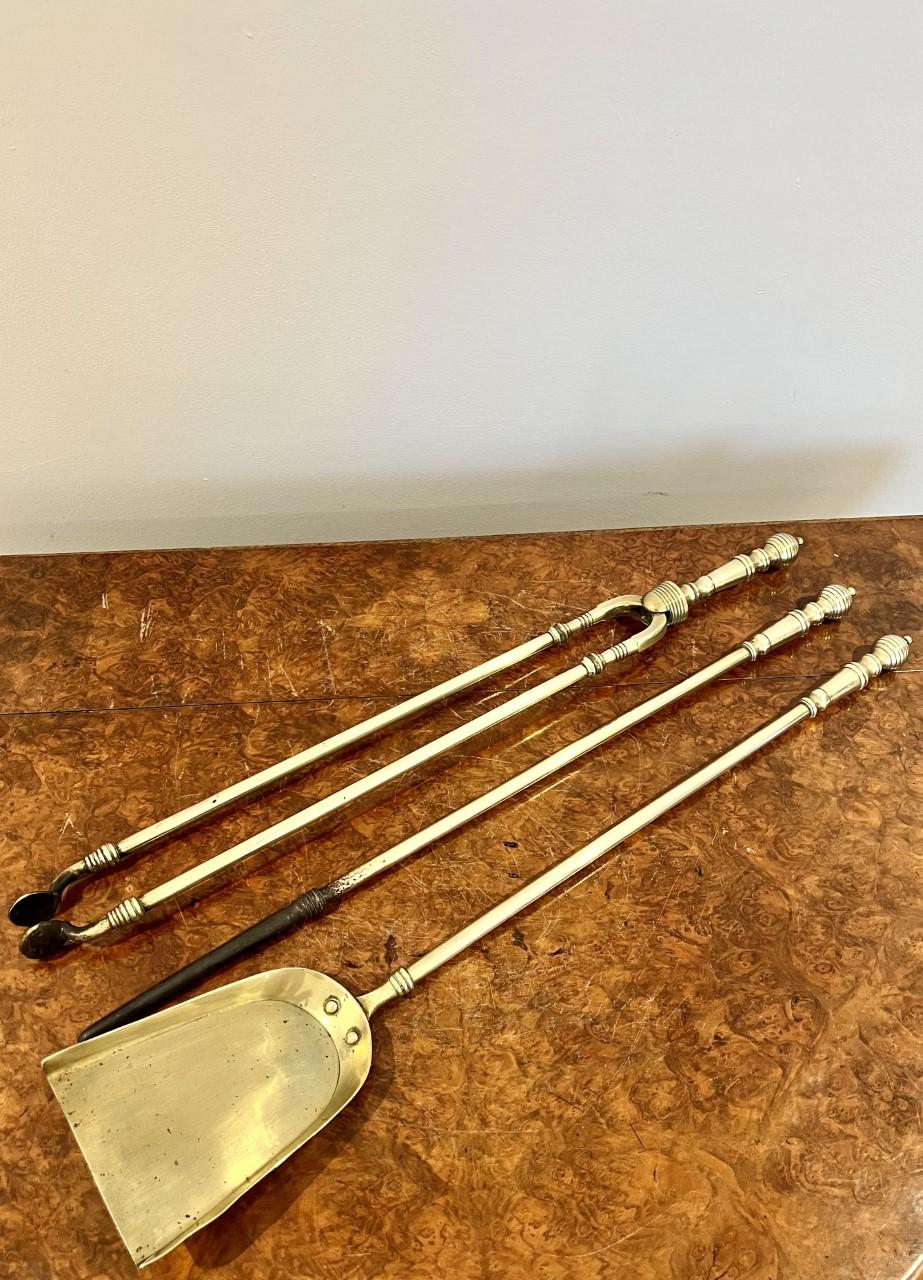 Antique Victorian quality brass fire irons having a quality set of fire irons with circular detailed handles consisting of a shovel, poker and a pair of tongs.