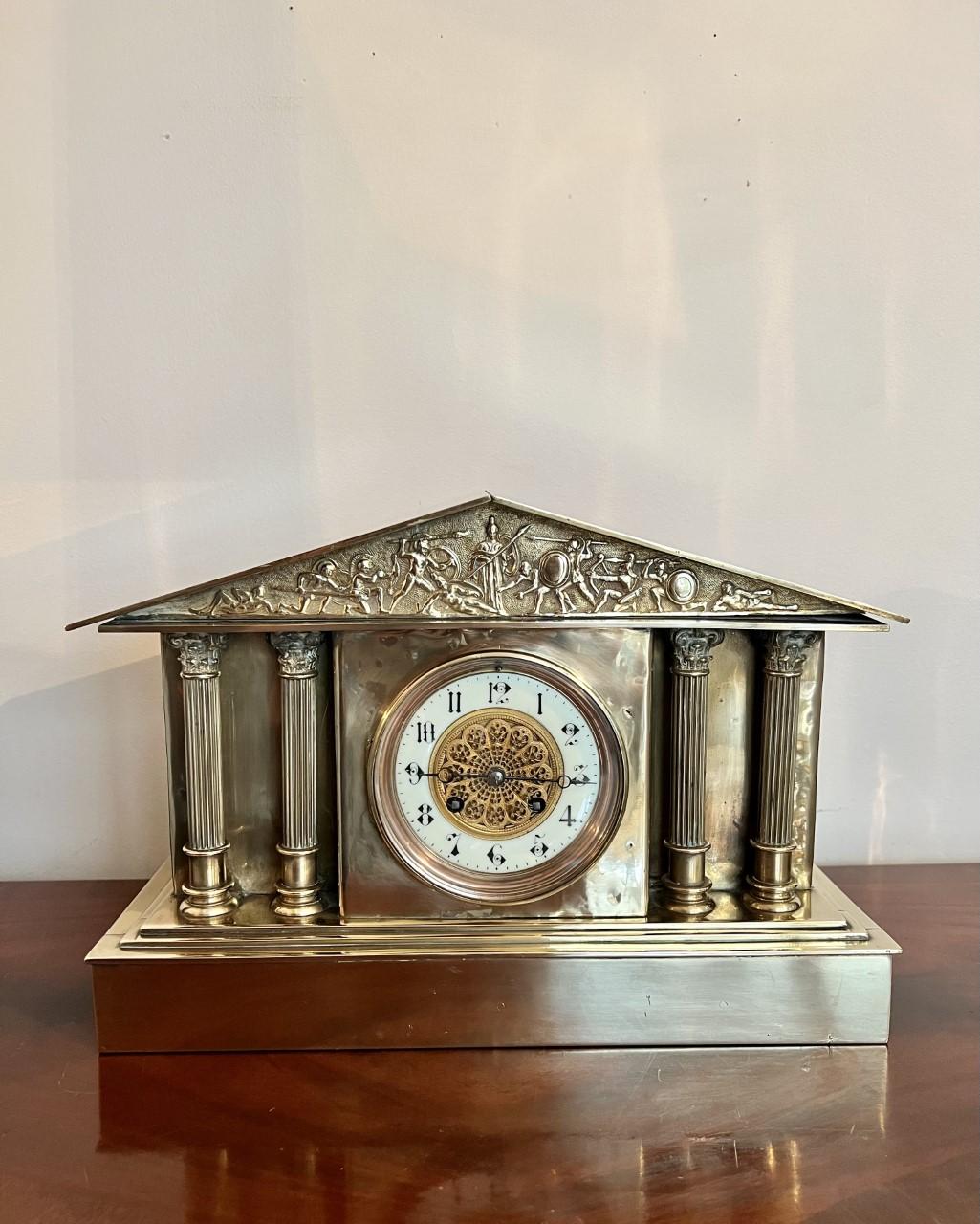 Antique Victorian quality brass mantle clock having a quality antique Victorian brass case with ornate decoration, circular dial with original hands, Roman numerals, 8 day French movement striking on the hour and half hour on a gong with the original key