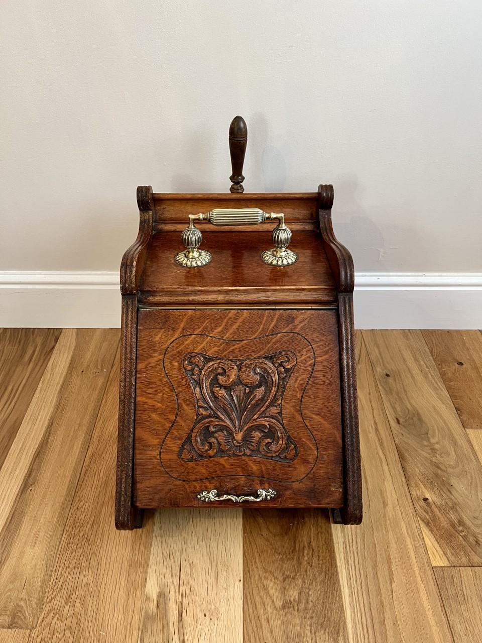 Late 19th Century Victorian antique quality carved oak coal box having a quality ornate brass carrying handle to the top, original brass shovel to the back a lift up carved front opening to reveal a coal storage compartment with the original tin liner