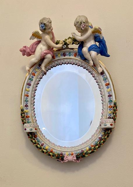 This is a quality mid 19th Century Continental antique porcelain oval mirror having a quality continental porcelain mirror with two cherubs to the top and pink ribbon to the bottom in wonderful hand painted blue, pink, yellow, green, orange, white and gold colours.