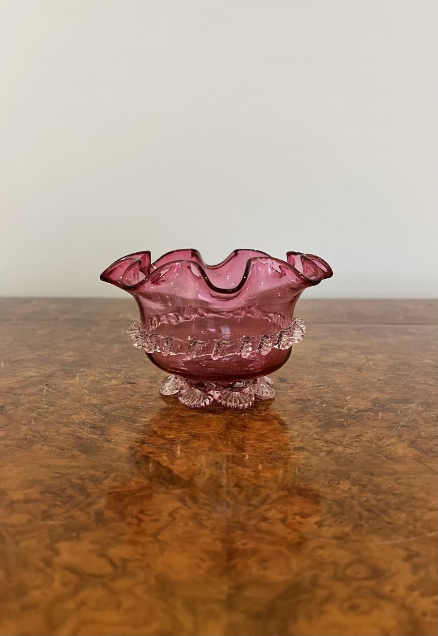 Antique Victorian quality cranberry glass bowl having a quality original Cranberry glass bowl with a lovely shaped top, ornate glass detail to the middle standing on ornate glass feet.