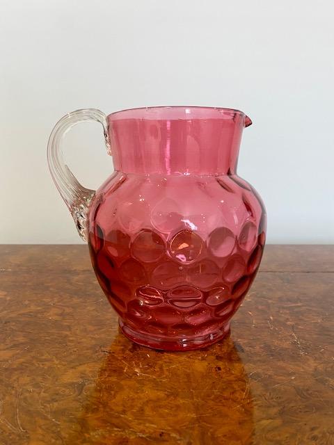 This is a quality late 19th Century Victorian antique cranberry glass jug having a quality antique original cranberry glass jug with a shaped glass handle.