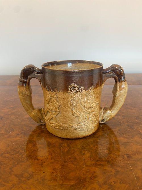 This is a quality late 19th Century Victorian antique Doulton loving cup, having a pair of shaped handles in the form of a Dachshund dog, Lovely harvest scene decoration to the cup in wonderful light and dark brown colours.