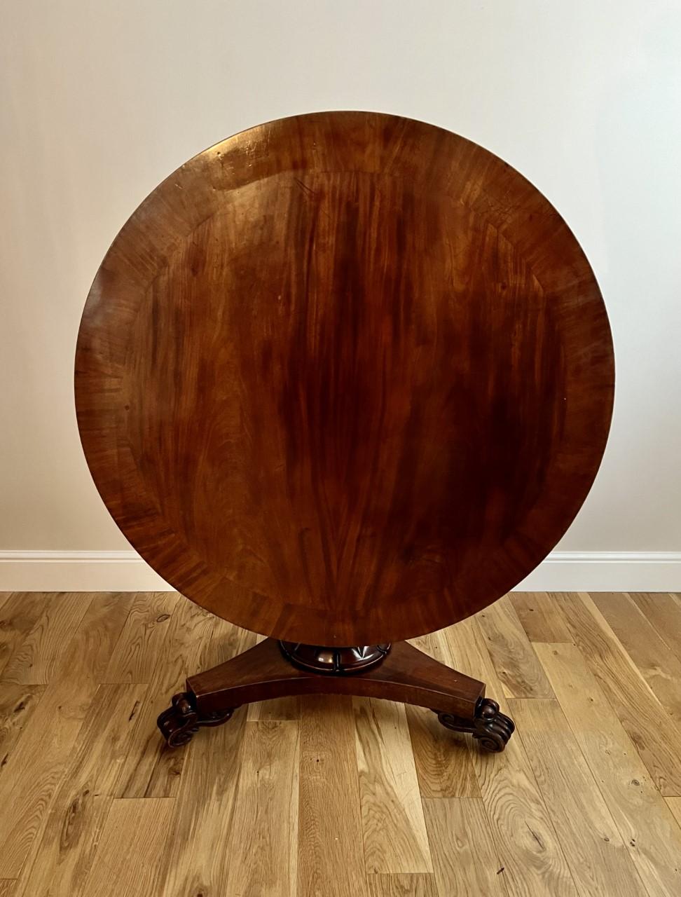 Antique Victorian quality figured mahogany circular table having a quality circular figured mahogany tilt top dining table with a cross banded edge, mahogany frieze supported by a turned column pedestal with a carved collar standing on a platform base raised by three carved scroll feet