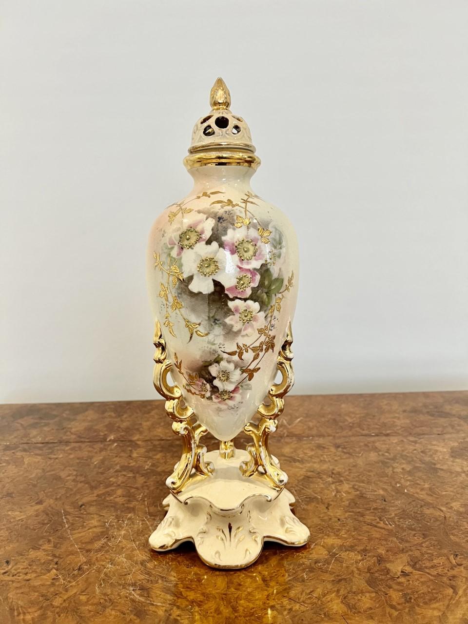 For sale is this late 19th Century Victorian antique quality hand painted vase with wonderful flower decoration in pink, green, yellow and gold colours with the original lid.