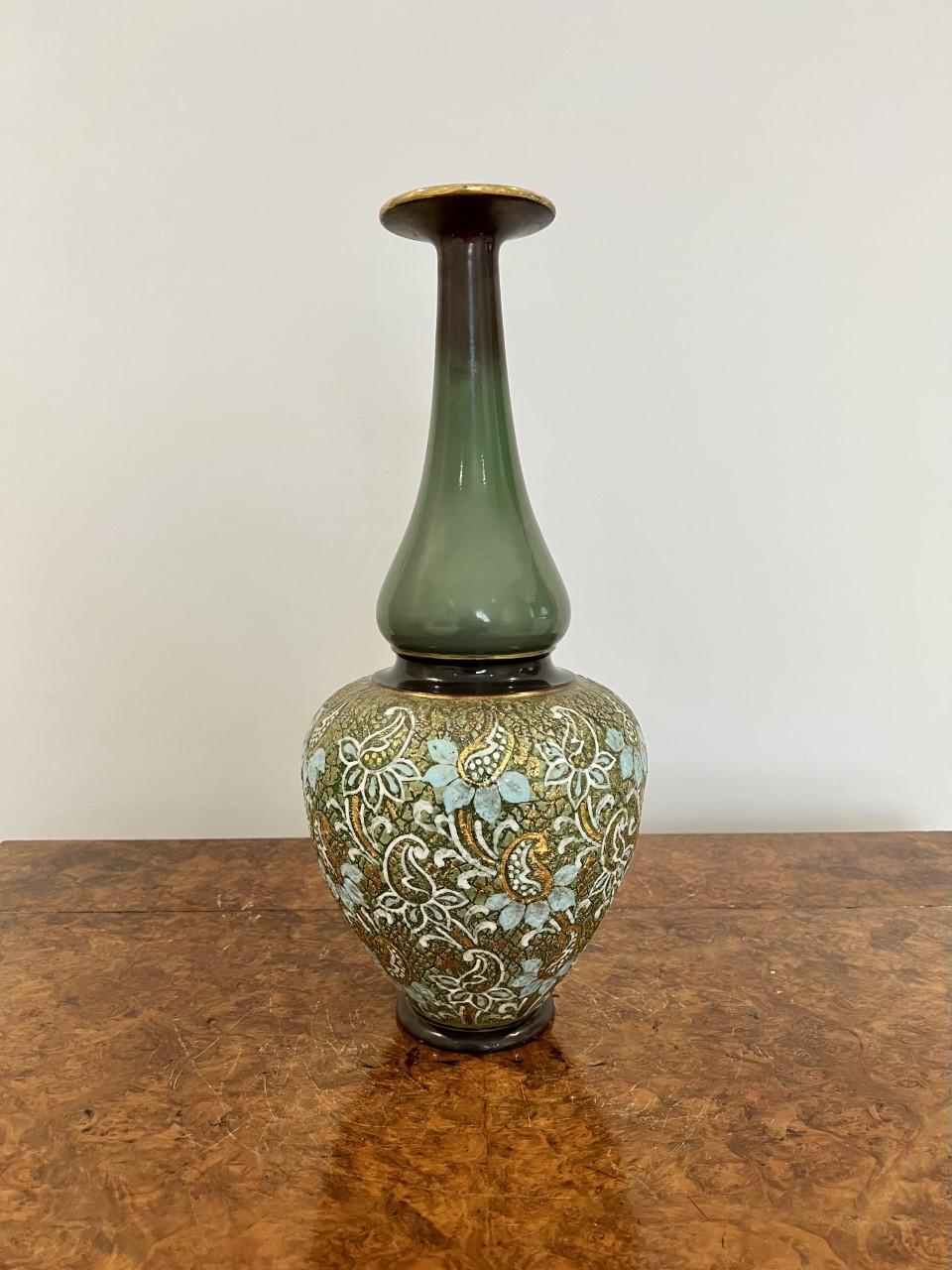 Antique Victorian quality large ballister Royal Doulton vase having a quality antique Royal Doulton shaped vase in green, blue, brown and gold colours with leaf and flower decoration
