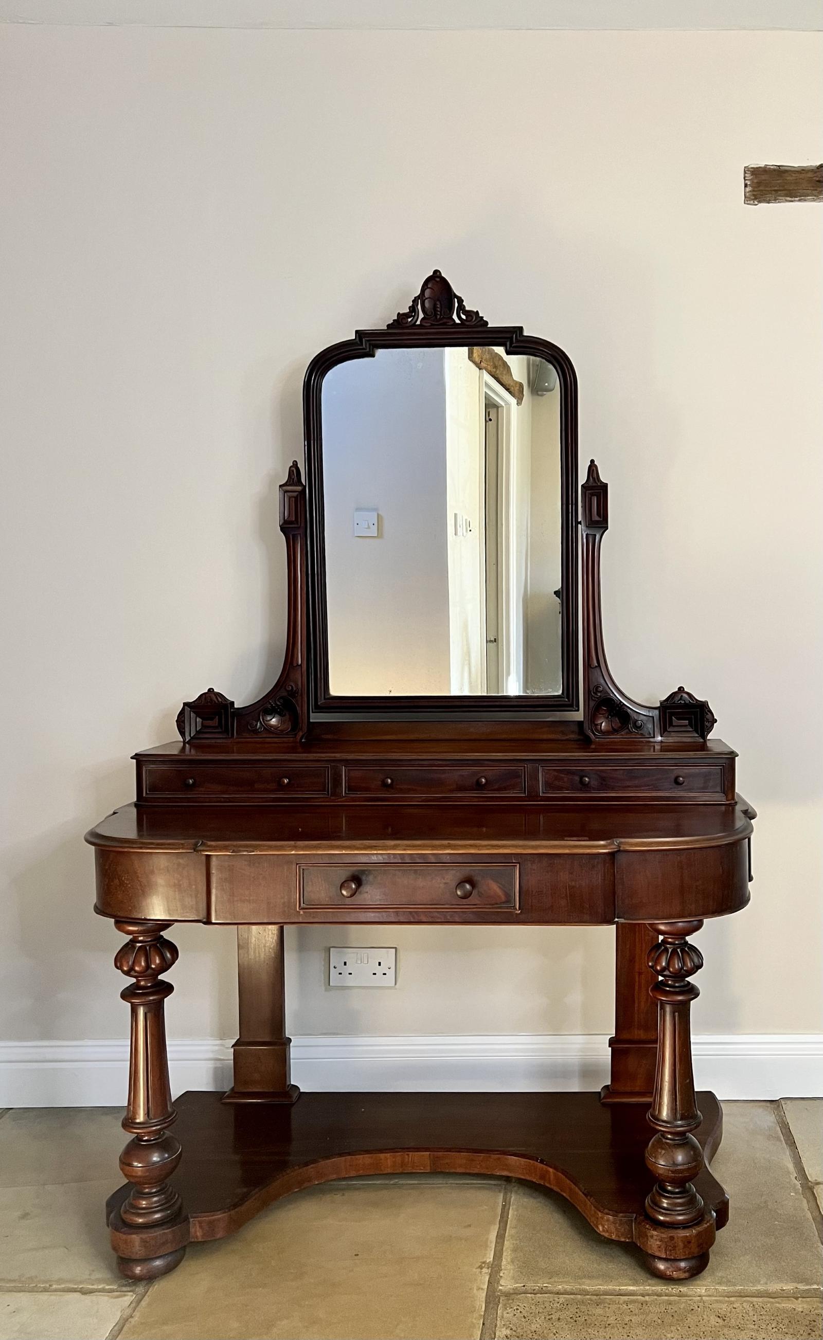 Antique Victorian quality mahogany duchess dressing table having a tilting mirror supported by quality carved mahogany arms above three drawers with original turned mahogany knobs, above a mahogany top with a thumb moulded edge, a single drawer to the frieze standing on turned reeded carved legs, united by a shaped undertier standing on bun feet.