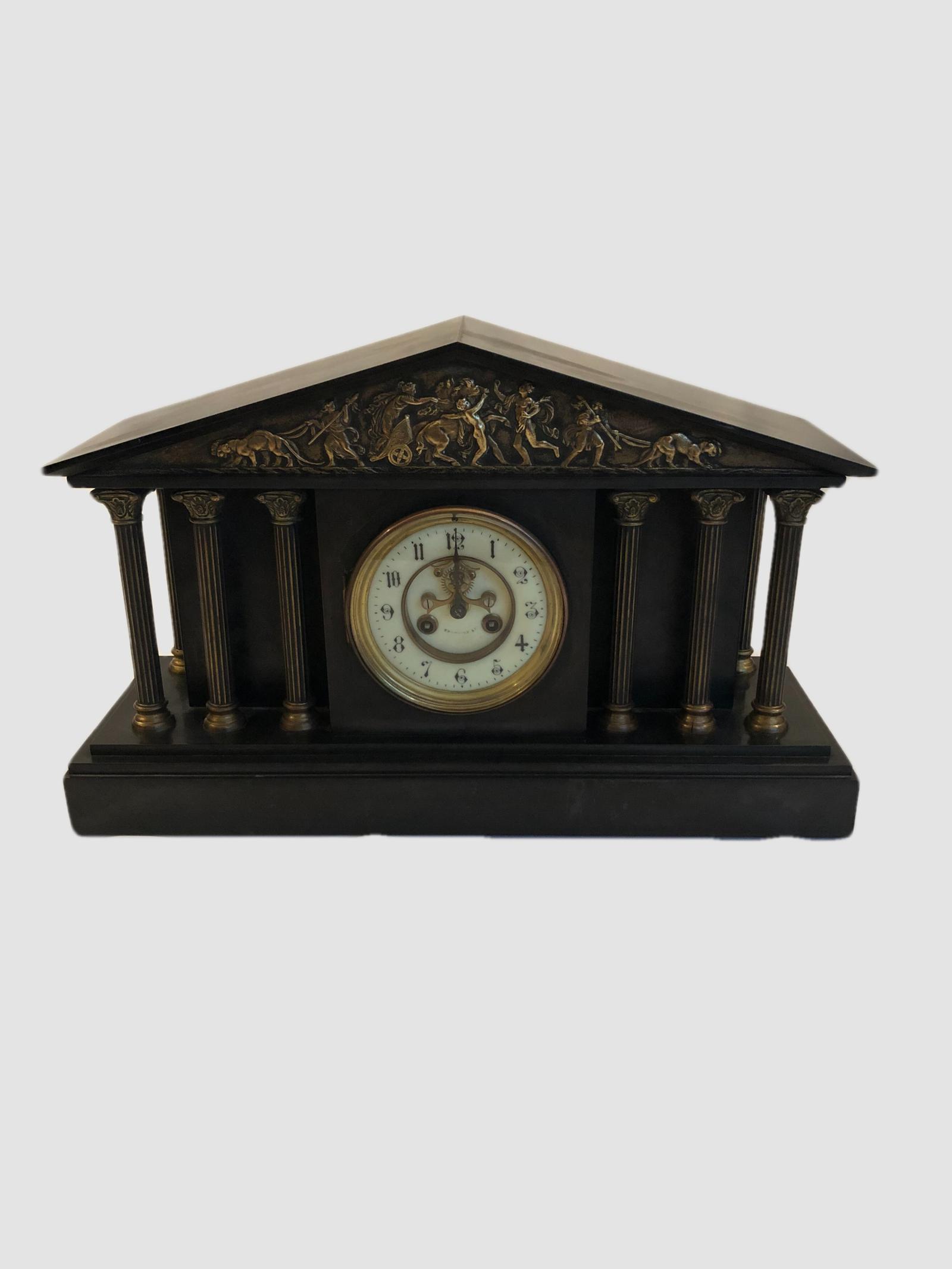 Antique Victorian Quality Marble Mantle Clock. Having a quality marble and ornate brass case with a 8 day movement striking the hour and half hour on a gong. Enamel white dial with original hands and front wheel escapement brass bezel.