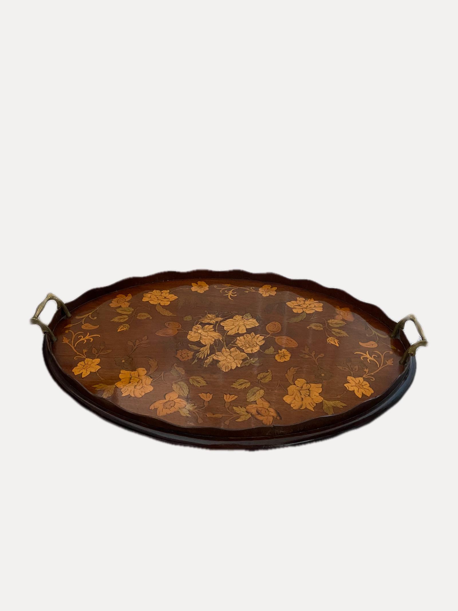 Antique Victorian quality marquetry inlaid oval tea tray, having a quality mahogany oval tea tray with fantastic marquetry inlaid to the top with original brass carrying handles.
