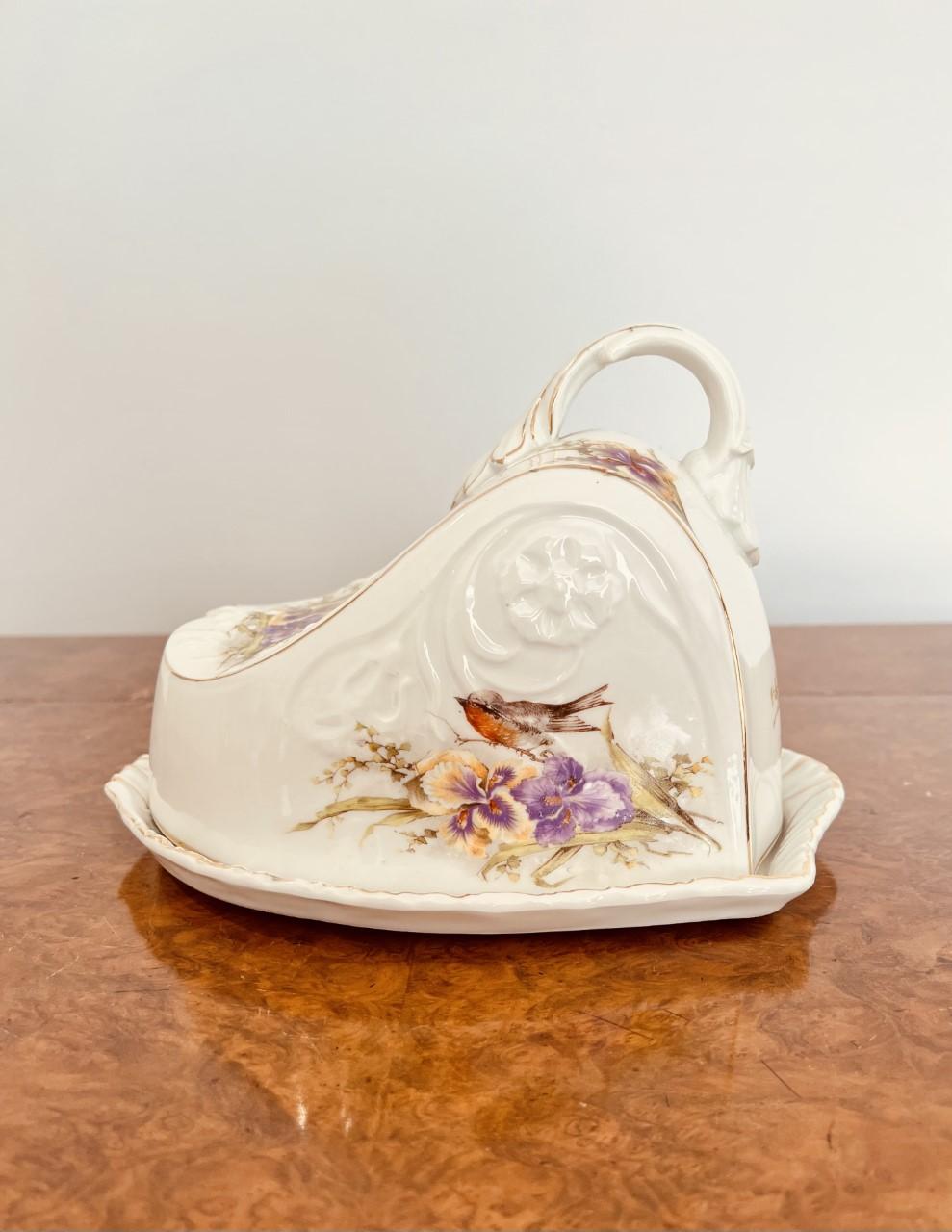 Antique Victorian shaped cheese dish having lovely hand painted flowers, leaves and birds in wonderful yellow, green, purple, red, white and gold colours with a shaped handle on the top on the original base