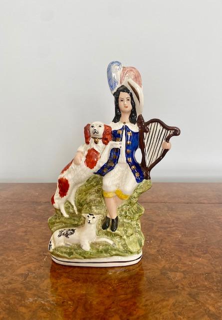 19th Century Victorian antique Staffordshire figure of a young lady sitting with her spaniel dog by her side and a lamb at her feet holding a harp in wonderful blue, red, green, yellow, black and white colours.