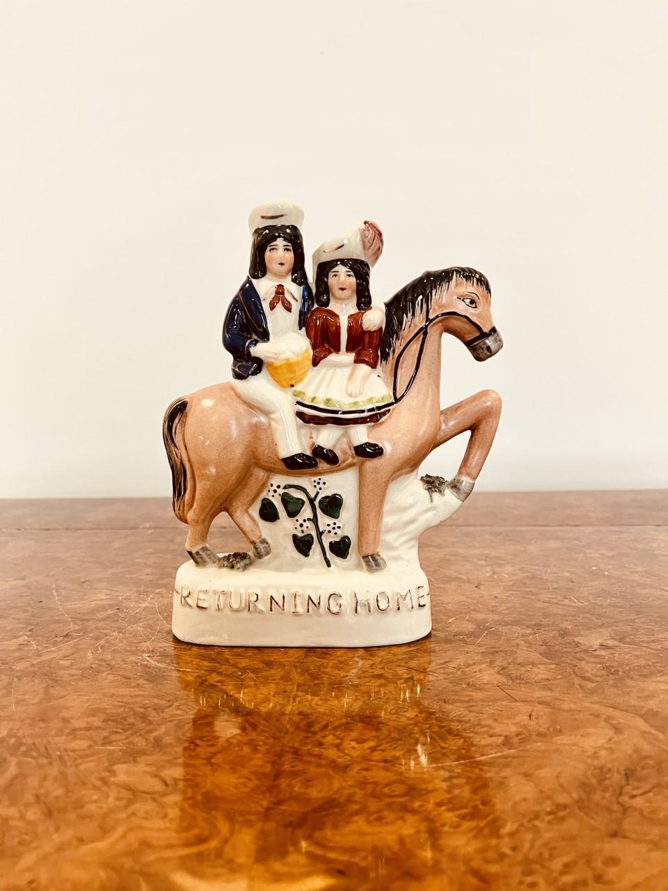 Antique Victorian Staffordshire 'returning home' figure of two people riding on a horse in wonderful period clothing in lovely green, yellow, brown, blue, red and cream colours