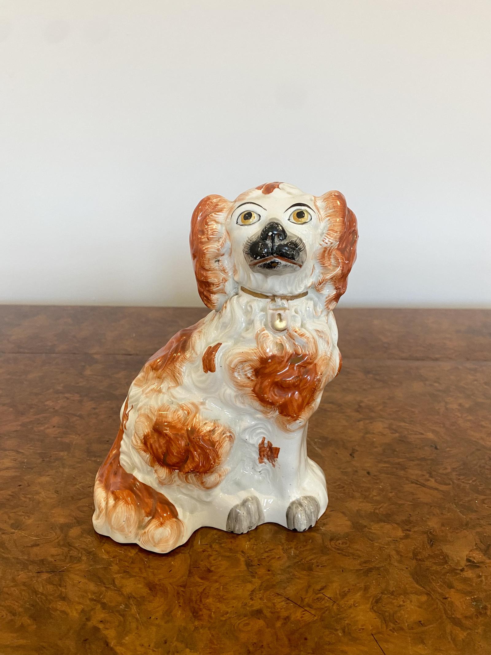 19th Century Victorian antique Staffordshire spaniel seated dog having a lovely colourful coat with a collar and padlock