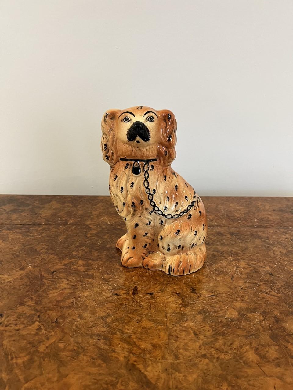 Antique Victorian Staffordshire spaniel seated dog having a lovely colourful coat with a black collar, padlock and chain.