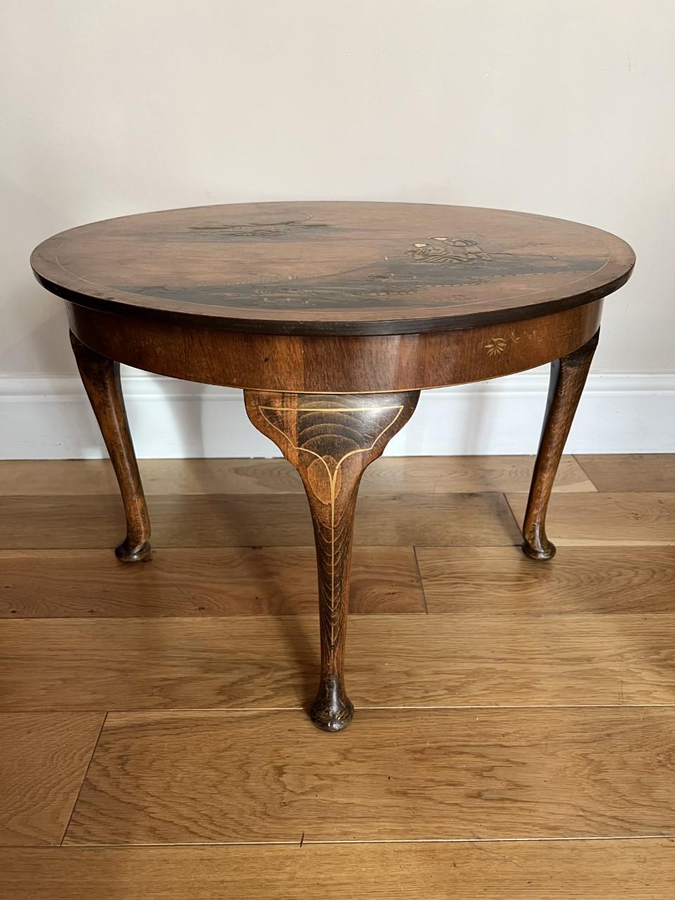 Antique walnut chinoiserie decorated circular coffee table having a quality antique coffee table with a circular walnut chinoiserie decorated top standing on four shaped cabriole legs with pad feet