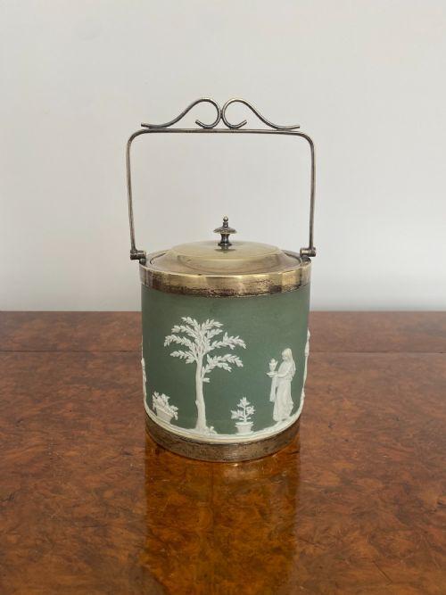Late 19th Century antique Wedgwood Jasper Ware biscuit barrel decorated with classical scenes in a white cameo and green background with a silver plated swing handle