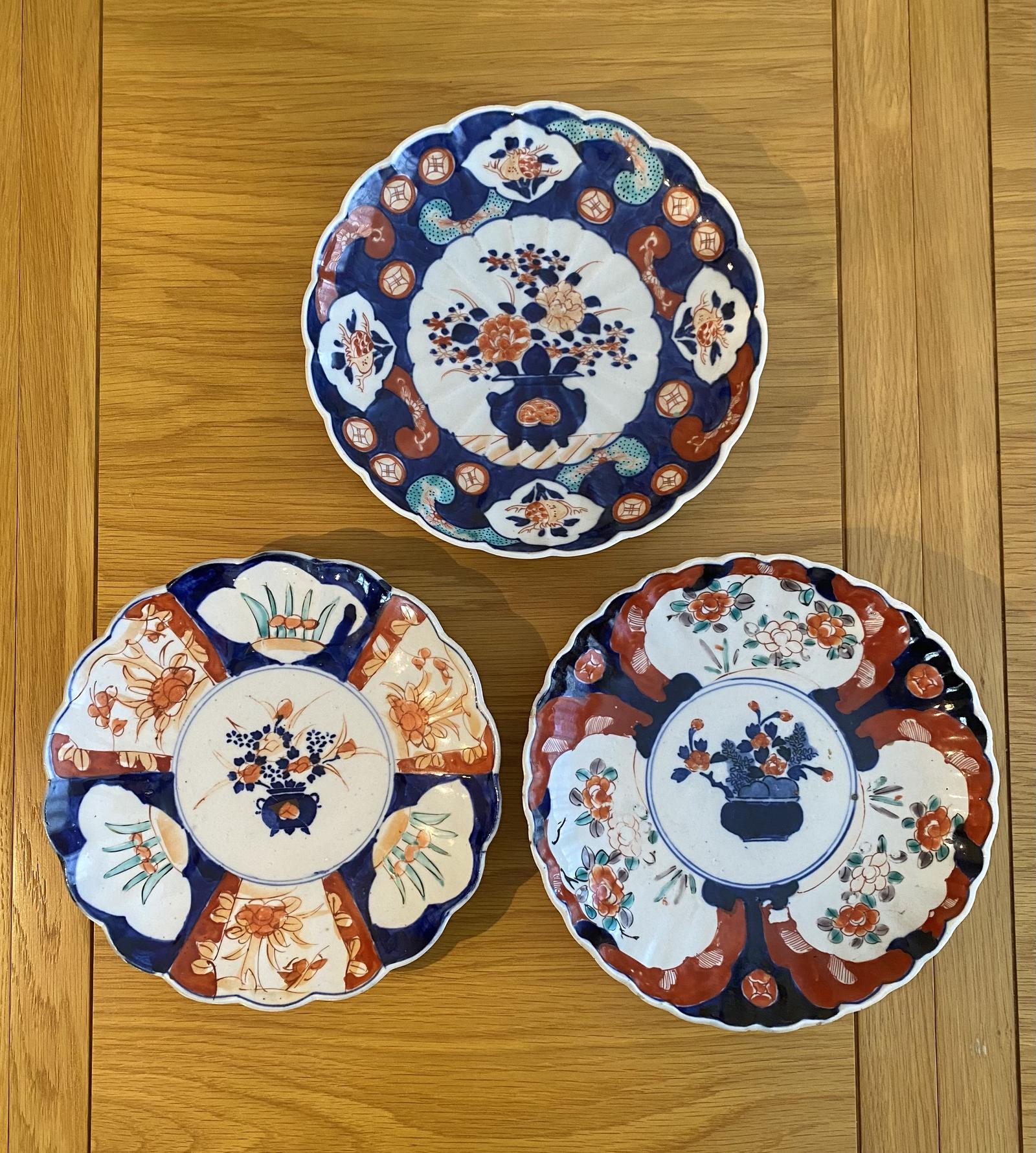 Collection of three quality antique imari plates, having scalloped shaped edges with hand painted panels of flowers in baskets in wonderful red, blue, green, white and gold colours.