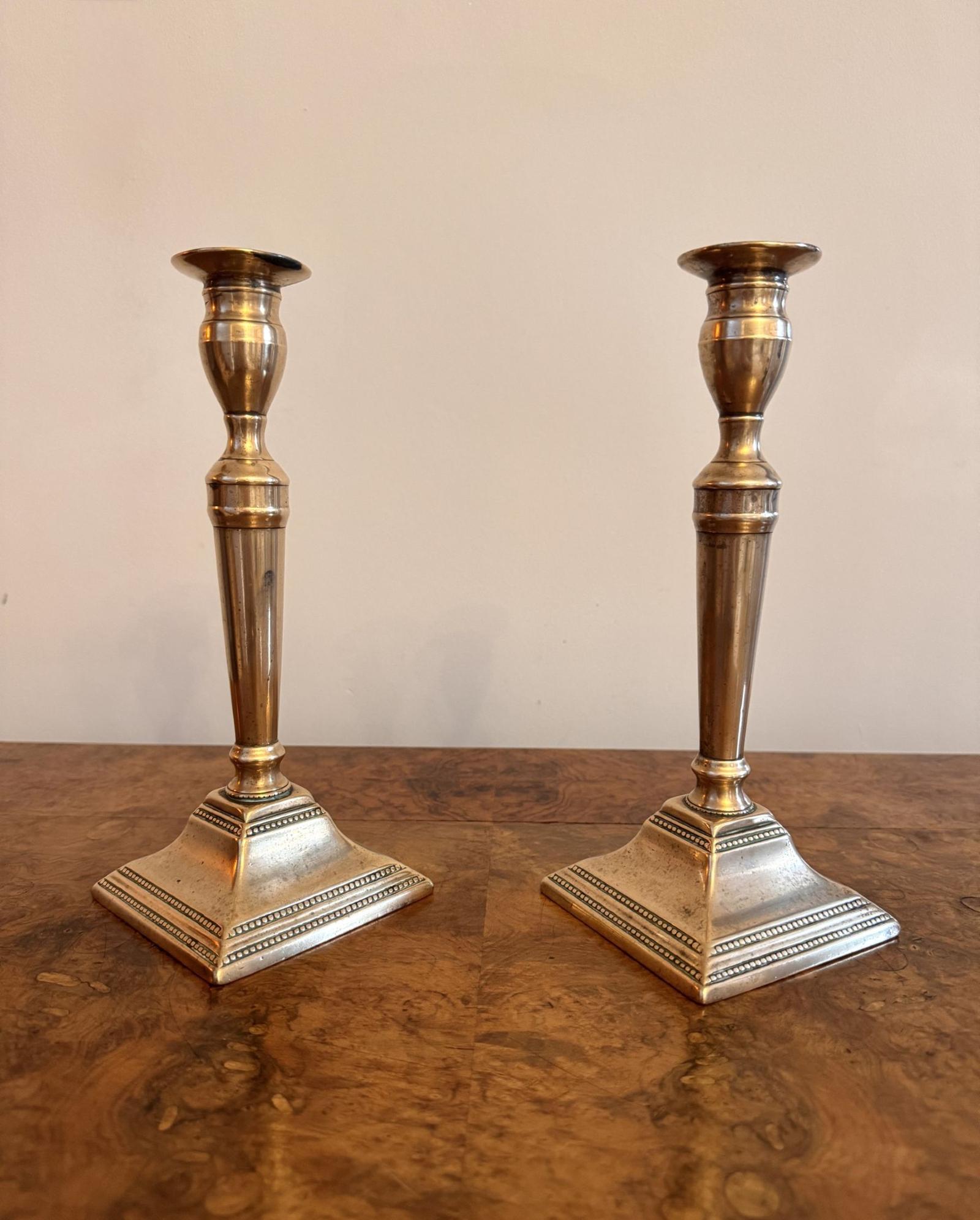 Elegant quality pair of antique Victorian brass candlesticks having a quality pair of antique brass candlesticks with turned columns raised on a stepped square brass base with beaded detail.
