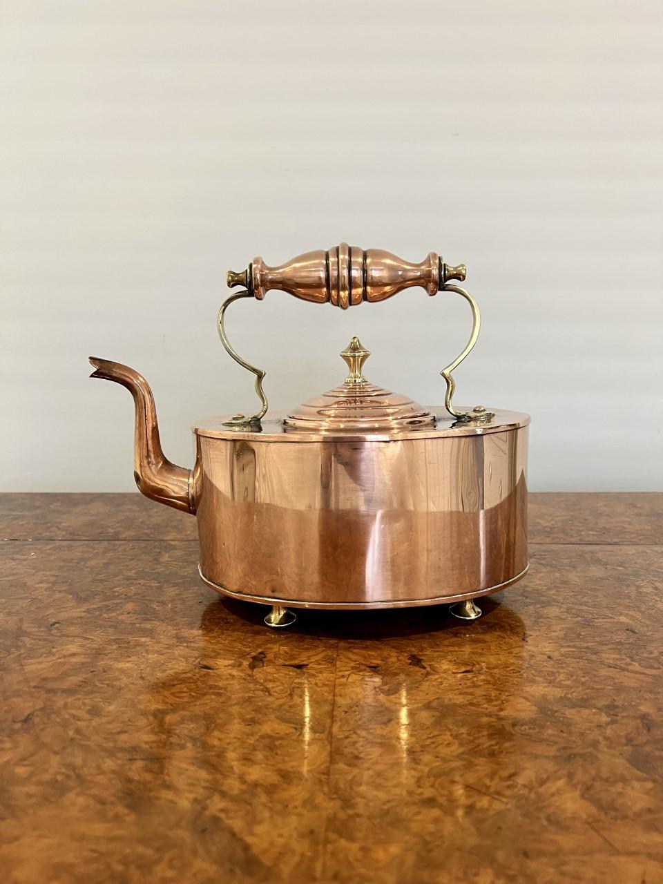 Fantastic antique Victorian unusual oval shaped copper kettle having a unusual oval shaped copper kettle with a copper turned handle and brass supports standing on four brass feet.