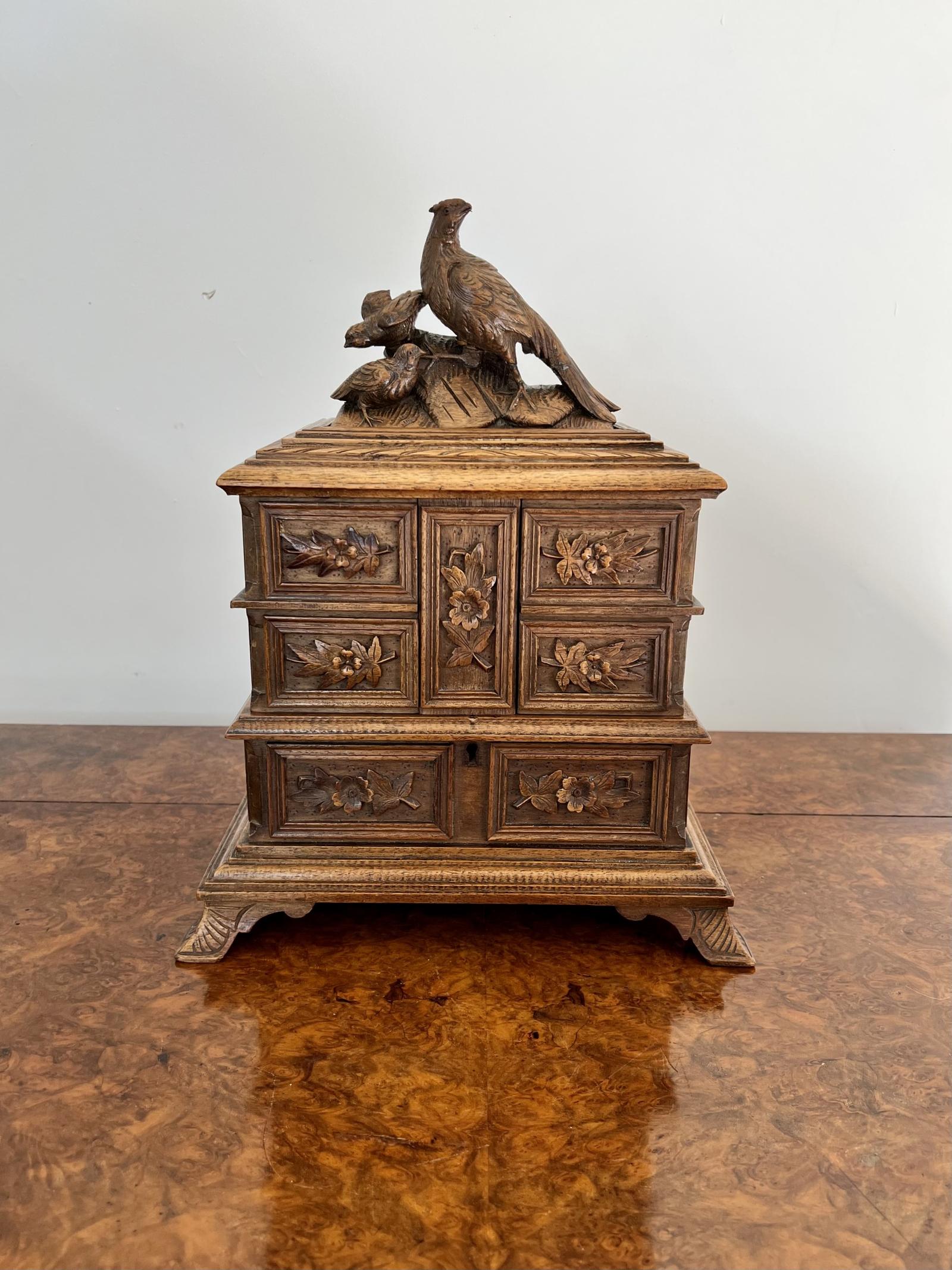 Fantastic Black Forest carved walnut large jewellery table cabinet having quality carved birds to the top of the lift up lid opening to reveal a jewellery compartment and four swing out drawers, Having one long drawer to the base with red interior, carved all over in quality Black Forest carving standing on carved walnut shaped feet.