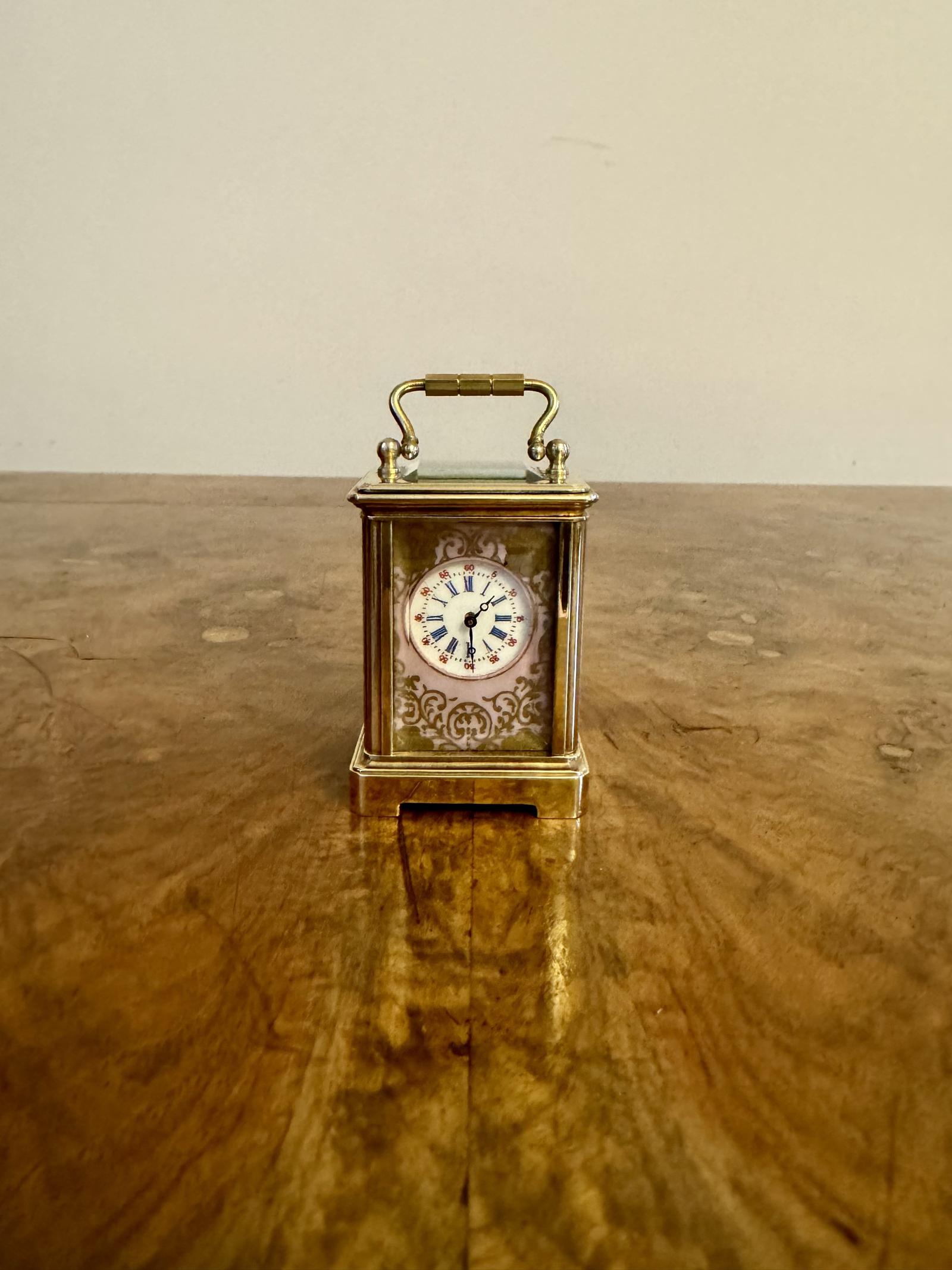 Fantastic quality antique Edwardian miniature carriage clock having a quality brass case with beautiful hand painted porcelain panels decorated with flowers in pink, green and yellow colours surrounded by gold scrolls, having an 8 day French movement, a white porcelain dial with blue Roman numerals.