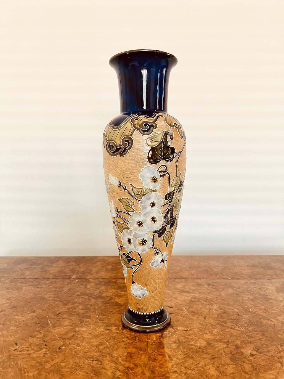 Fantastic quality antique Victorian Doulton patent vase having a flared blue and brown scroll moulded tapering neck and shoulder above a moulded tapering body with wonderful raised foliate decoration on a blue beaded foot
