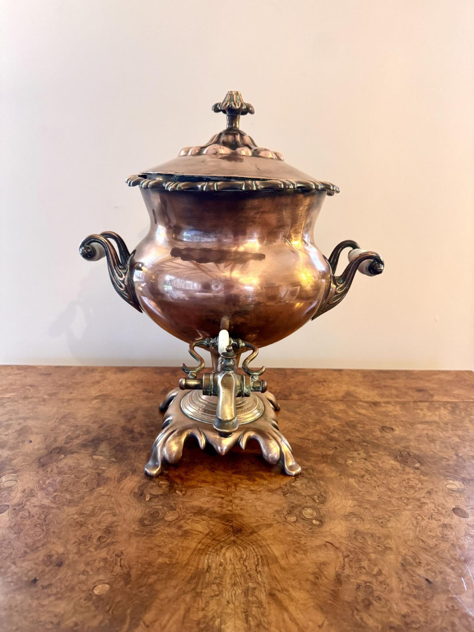 Fantastic quality antique Victorian large copper samovar with ornate detailing, with a lift off lid and the original detailed knob, with two carrying handles to the sides, a brass tap to the front, on a square base raised on four shaped feet.