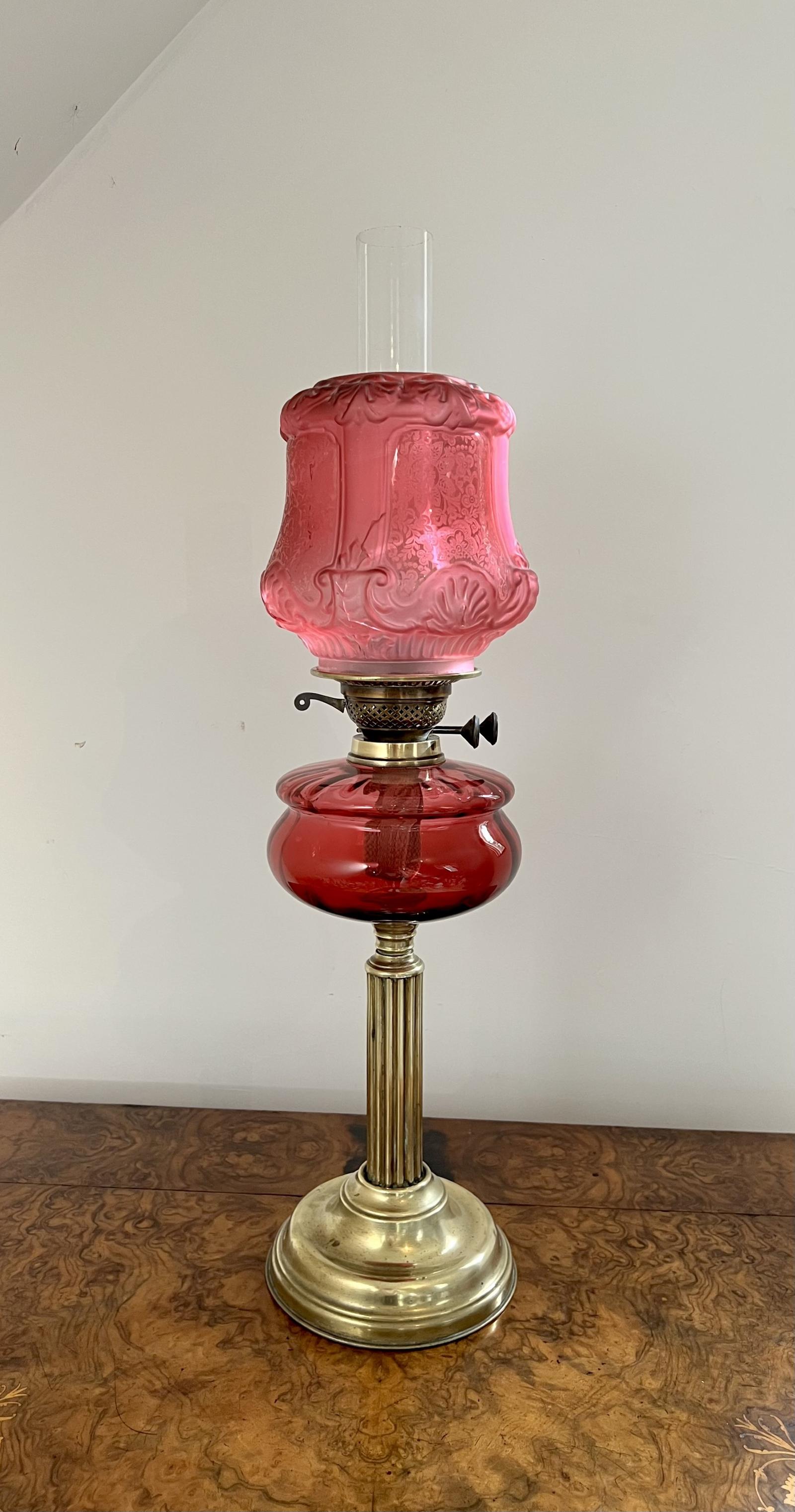 Fantastic Quality Large Antique Victorian Cranberry Glass and Brass Oil Lamp