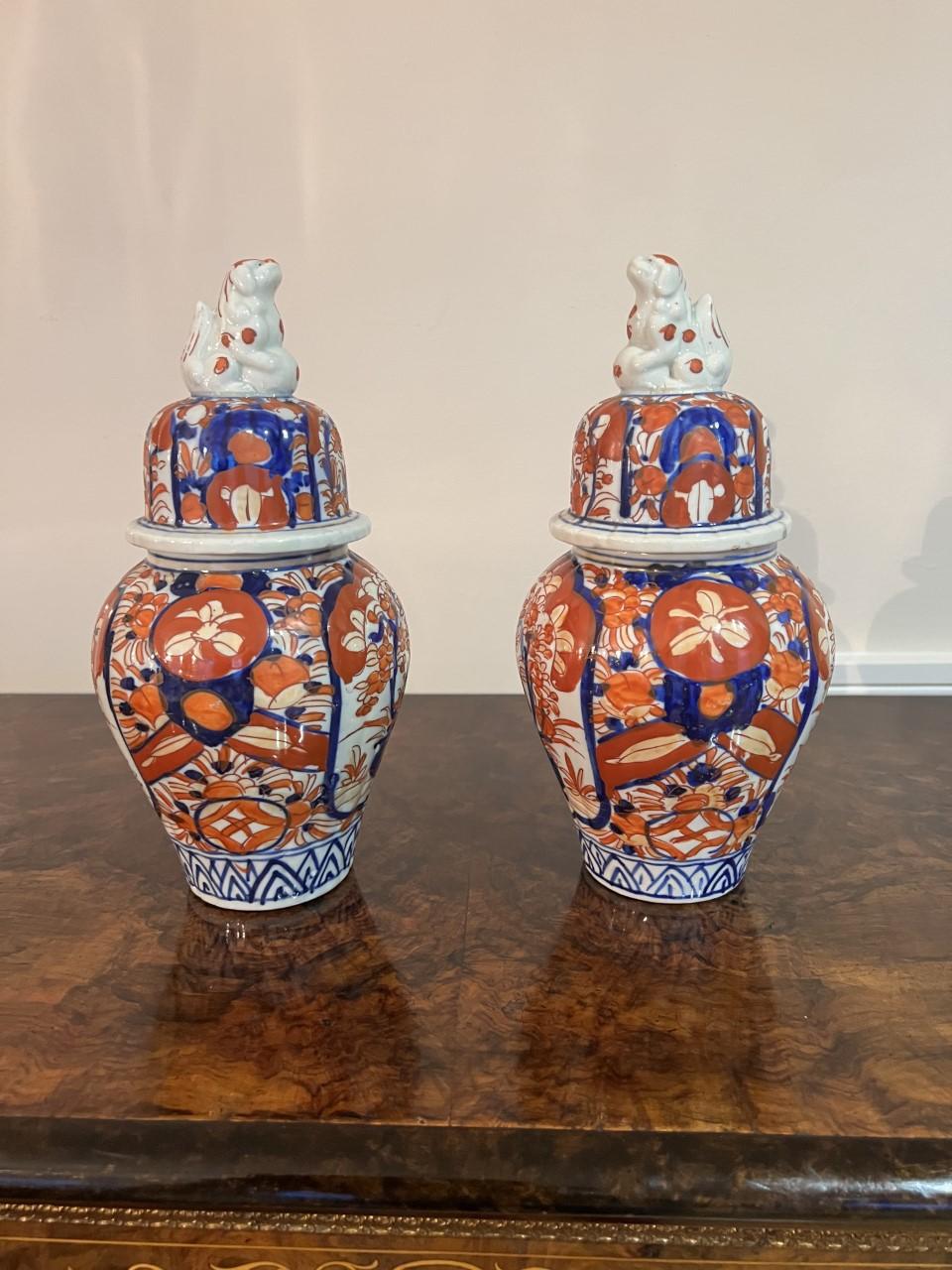 Fantastic quality pair of antique Japanese Imari vases having a pair of quality antique Imari vases with wonderful hand painted flowers, leaves and trees in vibrant red, orange, white and blue colours with removable lids that have dogs of fo to the tops