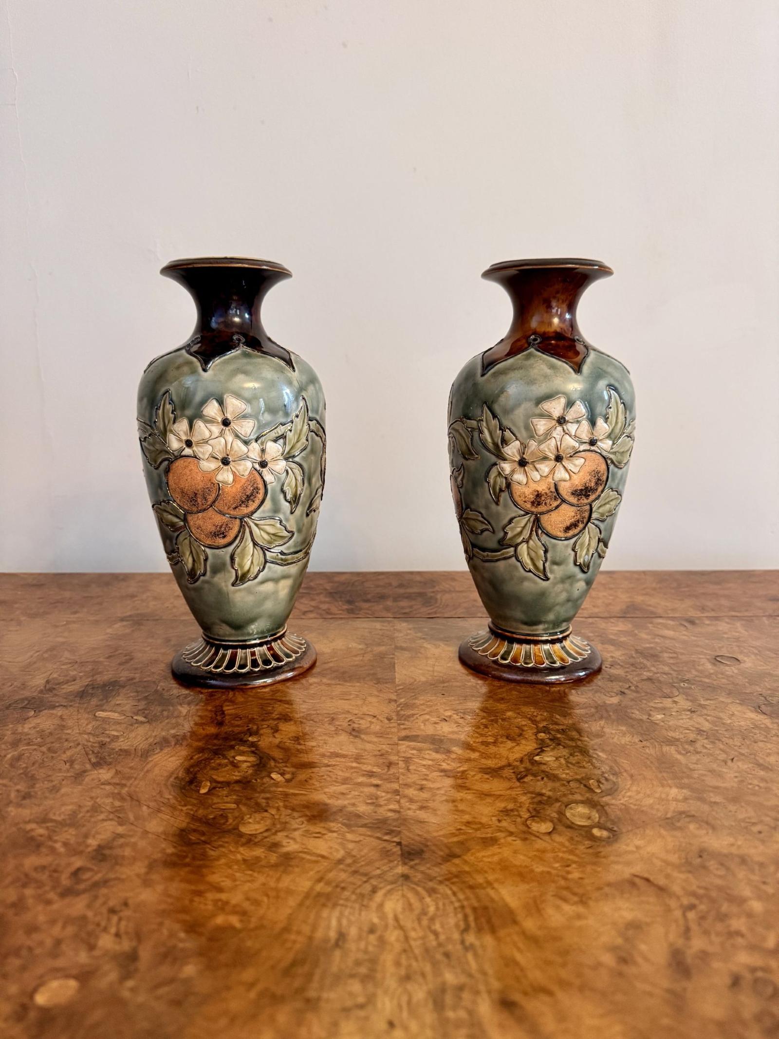 Fantastic quality pair of Doulton Lambeth vases by Eliza Simmance, having a quality pair of Doulton Lambeth vases with a bulbous shaped body decorated with relief decoration with fruit, flowers, leaves and blossoms in orange, green and cream colours on a green ground, with a brown slender fluted shaped neck, raised on a circular shaped base with a decorative scalloped pattern hand painted in green and brown tones.