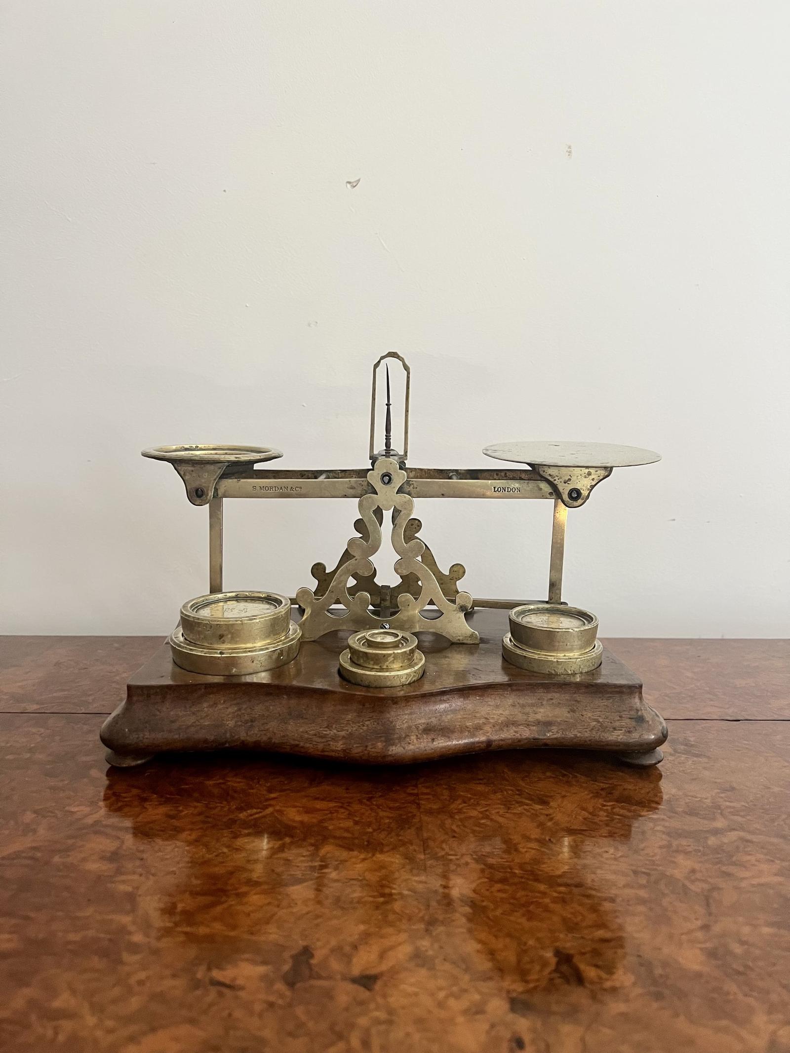 Fantastic set of large antique Victorian postal scales and weights by S.Mordan having a fantastic quality set of antique Victorian scales by S.Mordan & Co London, the brass scales mounted on a walnut base raised on bun feet with the original brass weights.
