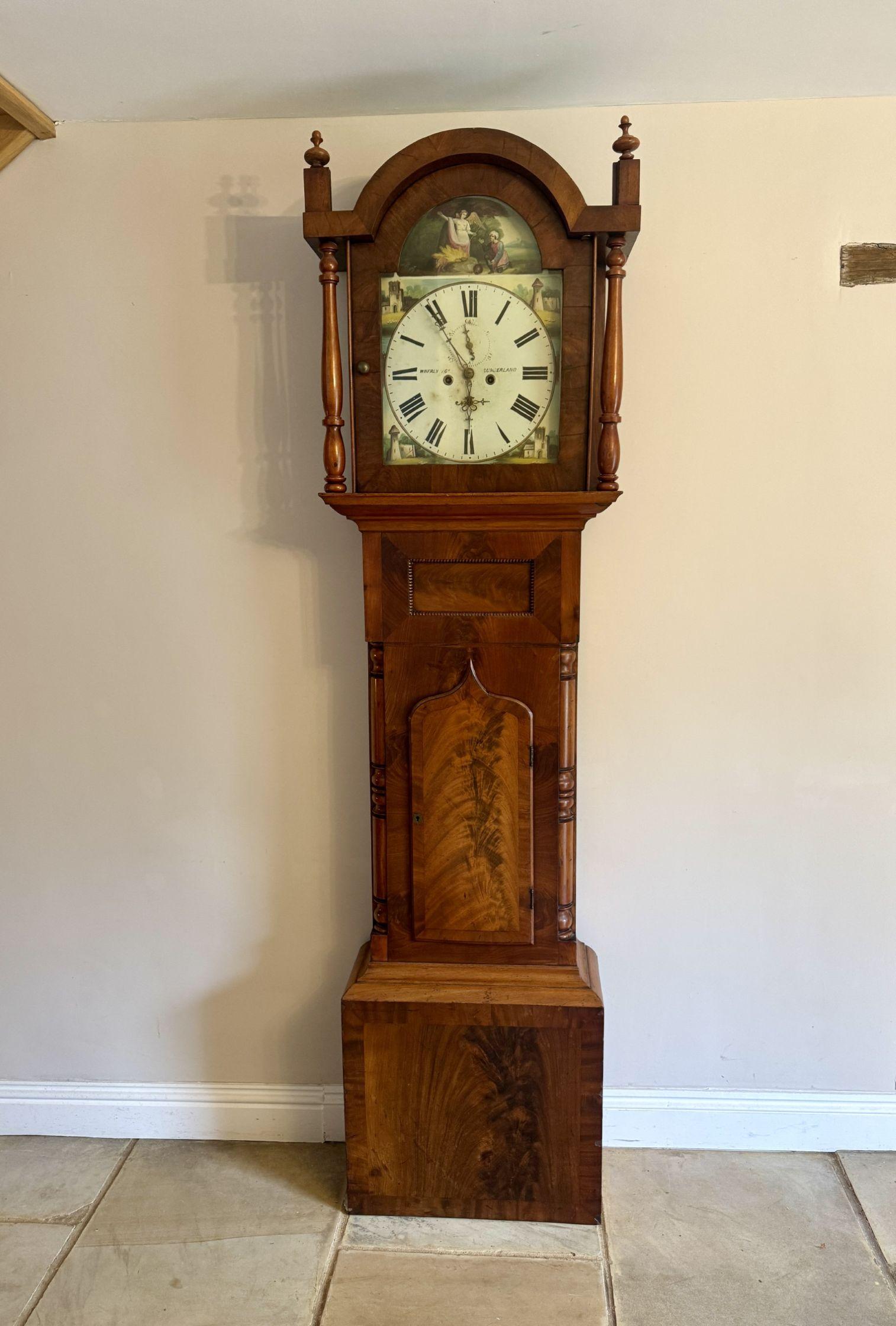 Fine quality antique 19th Century mahogany arch dial long case clock, having a quality antique Victorian long case clock with a rounded shaped hood above turned mahogany columns flanking a single glazed door casing a painted arched dial, featuring two classical figures in a pastoral setting above a circular dial with Roman numerals and the original ornate hands, the dial signed Wherly & Co Sunderland surrounded by hand painted architectural scenes, having a quality eight day movement striking on a bell, above a elegant single arched panel door opening to reveal the original pendulum and weights, standing on a quality rectangular shaped base, having the original winding key, Good condition as shown.