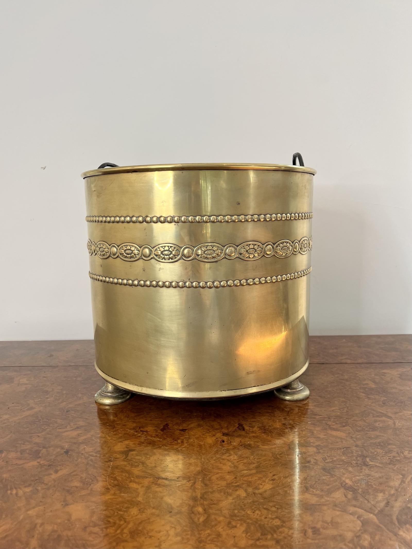 Fine quality late 19th Century Victorian antique brass log bin with quality ornate detail, the original tin liner raised on three circular feet.